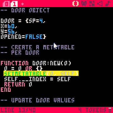 Cool, now writing with a more programming oriented language we have a door with just the variables (properties) and functions (Behaviors) that we need, now we just need to create our first door at the main loop of our PICO-8 project